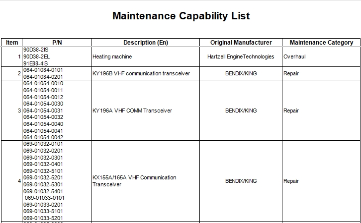 테스트, 수리 또는 정밀 검사 할 수있는 1,000 개 이상의 부품 번호가 포함되어 있으며 Hartzell, BK 및 Garmin과 같은 OEM에 서비스를 제공 할 수있는 유지 보수 기능 목록입니다.